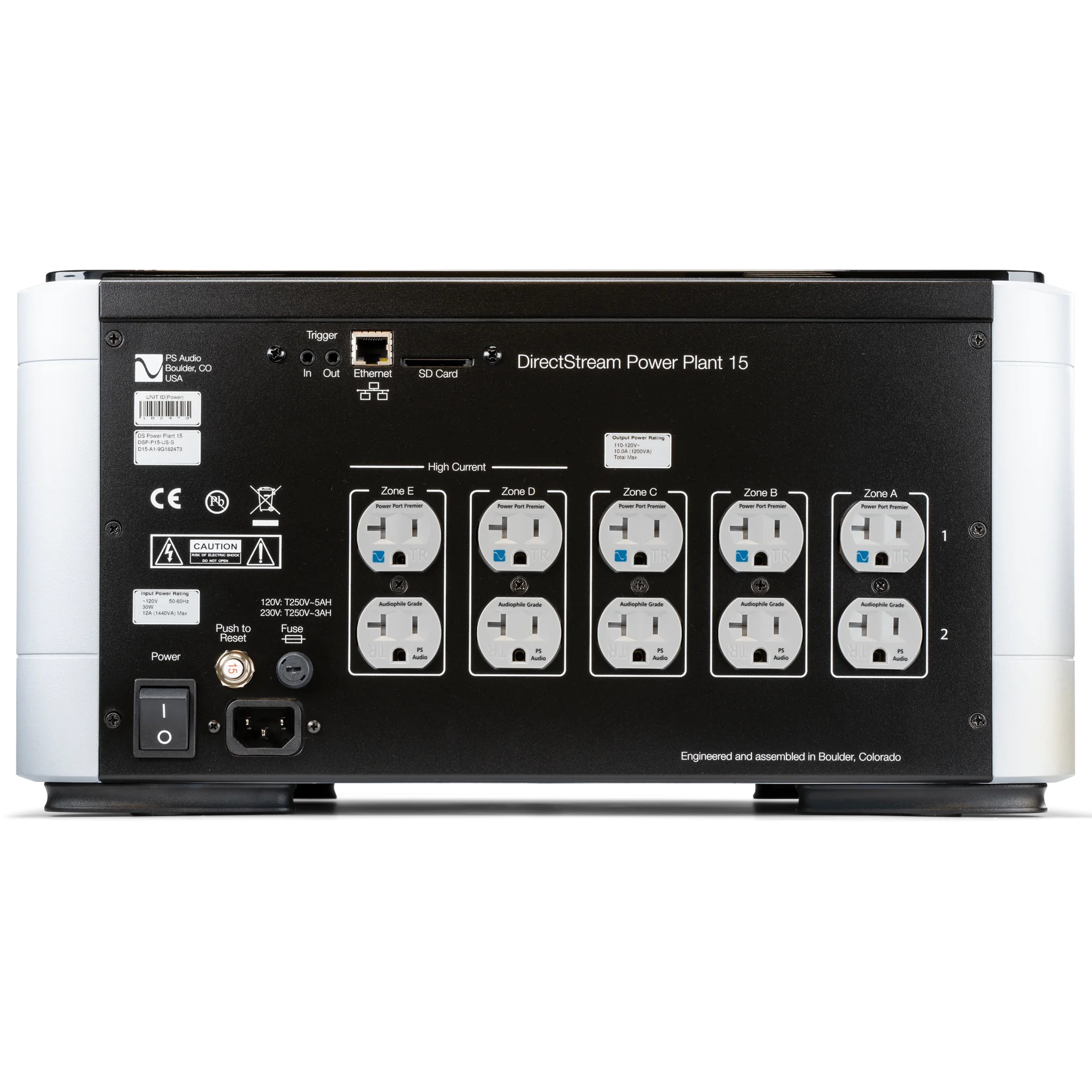 El P15 cuenta con un amplificador de potencia analógica de impedancia ultra baja, generador de ondas sinusoidales basado en FPGA basado en DSD (PCM) analógico puro y limpio, 10 salidas (versión US) en 5 zonas regeneradas separadas, y barras colectoras de cobre de 1/4″ de espesor que suministran energía regenerada a cada receptáculo. A través de la regeneración, el P15 crea una forma de onda de CA completamente nueva que agrega energía faltante a la línea eléctrica para corregir problemas graves.